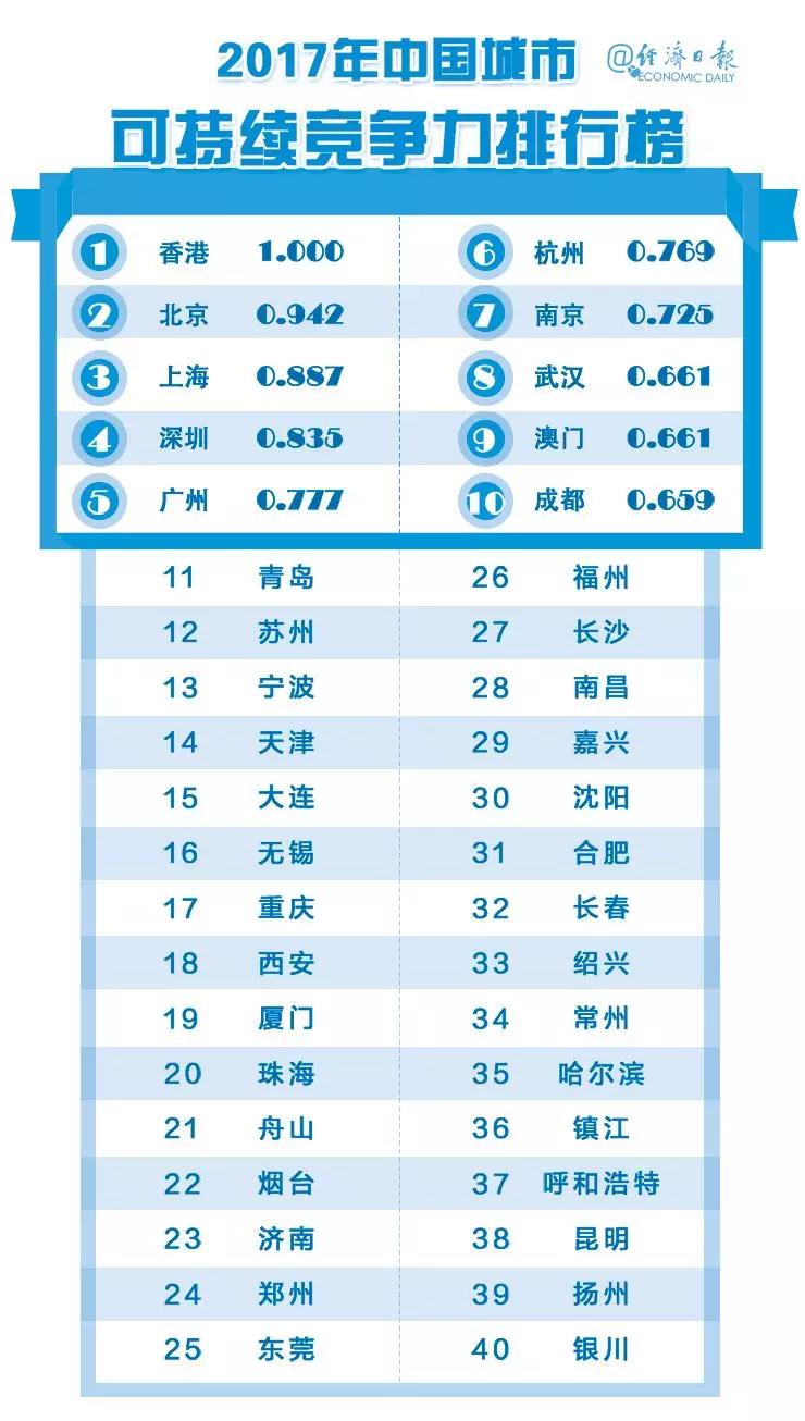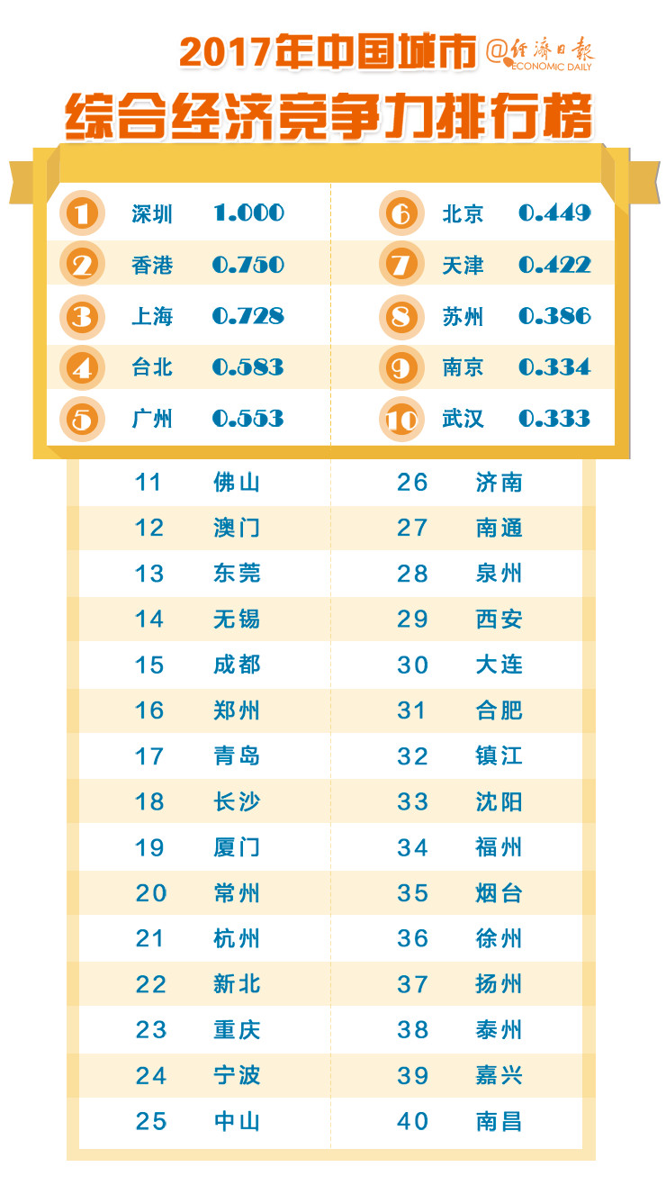 经济发展仍然是城市所有发展的基石。与2016年相比,综合经济竞争力前5名没有变化,6到10名变化明显。