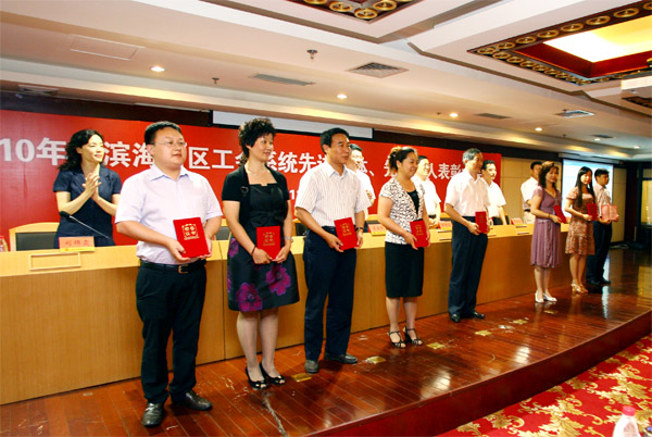 7月5日下午,滨海新区总工会召开大会,对2010年度工会系统先进集体及个人进行隆重表彰。滨海新区总工会领导刘明森、吴寅秋、于忠义、张雅萍、张建起、刘锦霞为荣获2010年度工会系统先进称号的集体及个人代表颁发了奖牌和荣誉证书。