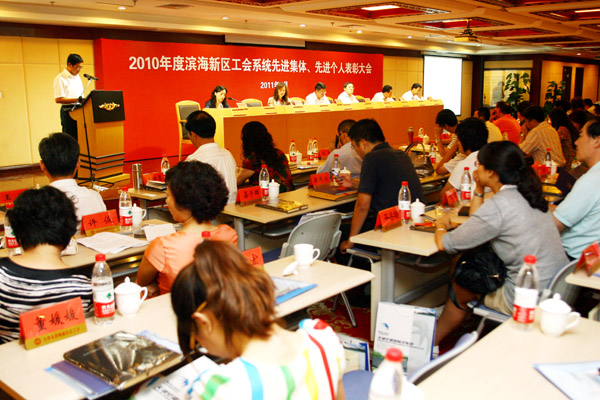 会议由刘锦霞副主席主持。会上宣读了表彰决定,授予天津新港船舶重工有限公司工会委员会等30个基层工会“滨海新区模范职工之家”称号;授予天津市津英达塑料制品有限责任公司工会广达车间分会等41个工会小组(分会)“滨海新区模范职工小家”称号;授予滨海新区大港第二小学工会委员会等31个单位“滨海新区工会工作先进集体”称号;授予天津电装电子有限公司阎和君等81名工会干部“滨海新区优秀工会工作者”称号;授予嘉里粮油(天津)有限公司高洪宇等70名同志“滨海新区优秀工会积极分子”称号;授予天津凯发电气股份有限公司王伟等29名行政领导 “滨海新区优秀工会之友”称号。模范职工之家、天津长芦汉沽盐场有限责任公司工会和九三集团(天津)大豆科技有限公司工会,工会工作先进集体、天津天地伟业数码科技有限公司工会和大港凯旋幼儿园工会,优秀工会工作者、锦湖轮胎(天津)有限公司工会主席崔光石和塘沽新港街道工会联合会副主席许俊先后从不同角度做了先进事迹发言。