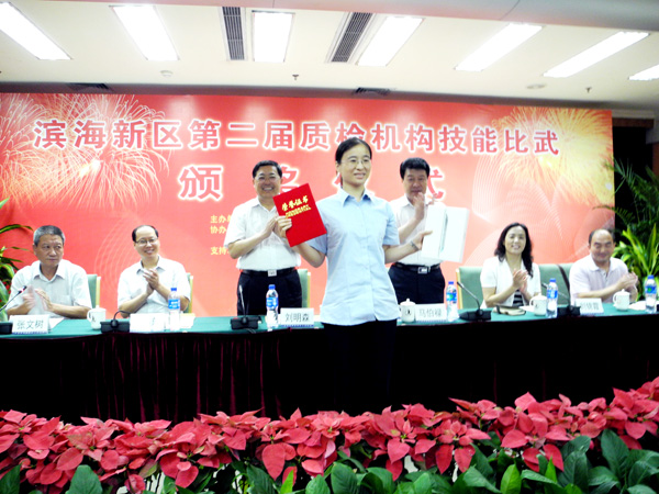 8月9日上午 ,滨海新区第二届质检机构技能比武颁奖仪式在开发区金帆酒店举行。新区质监局党组书记、局长马伯禄,新区总工会党组书记、主席刘明森,副主席刘锦霞,团区委副书记祝照新,新区建交局建筑管理处处长窦福起等领导分别为获奖选手和代表颁发了证书、奖章。国家建筑科学研究院检测中心的专家对此次比武进行了技术点评,认为选手们的理论水平很高,现场操作动作规范,能在规定时间内准确完成实验,赛出了很高的水平。新区质监局所属各部门负责人、参加决赛的全体选手以及新区范围内通过省级计量认证检测机构的负责人参加了颁奖仪式。