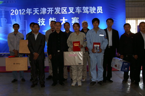 仪式后举行了天津开发区2012年第三届叉车驾驶员技能大赛。 经过紧张的比赛,天津顶津食品有限公司王红梅勇夺桂冠,获得了大赛的一等奖;美克国际家私(天津)制造有限公司张丕明、天津丰通铝合金科技有限公司关占云获得二等奖;恒杰(天津)电力设备有限公司石超、中远关西涂料化工(天津)有限公司杨云良、天津杰士电池有限公司张爱营获得三等奖;天津矢崎汽车配件有限公司佟金强、天津金桥焊材集团有限公司周立顺、天津电装电子有限公司孙鑫、天津丰通铝合金科技有限公司韩世峰获得优秀奖。大赛获得圆满成功。