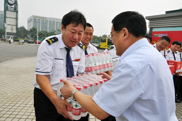 启动仪式前,刘明森深入到滨海公交集团518车队,慰问了坚守在公交一线的职工,给他们送去清凉饮料和防暑降温用品。