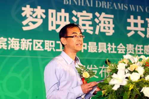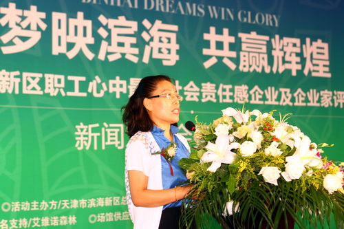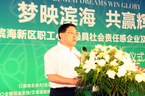 刘明森在致词中指出,此次是新区总工会依托社会力量办活动的又一大胆尝试,是贯彻党的群众教育活动的具体实践。通过群众性评选企业、企业家活动,树立新区职工群众心目中履行社会责任的企业形象、企业家形象,将和谐发展的理念推向企业推向全社会,让更多的企业家了解到为实现“中国梦”所担当的使命和责任,推动更多的企业和企业家诚心履行社会责任,使区域发展、企业发展与员工发展和谐共进,实现企业经济效益与社会效益和谐共赢。同时,通过由下至上的群众评选活动,引导广大职工自觉把个人梦想、家庭幸福与企业发展、新区发展紧密结合起来,用“中国梦”积聚团结奋进的正能量,努力营造积极健康、文明和谐的社会、企业文化氛围,激励全区人民在加快滨海新区开发开放的伟大实践中同心共筑“中国梦”。
