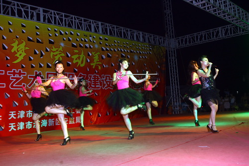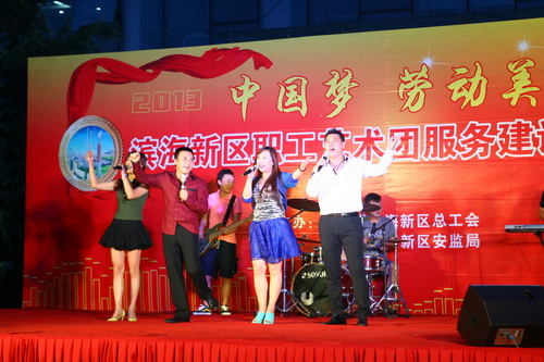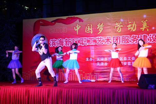 送安全、送文化、送健康、送清凉,八月酷暑迟迟不愿离去,滨海新区职工艺术团不畏酷暑,编排新的节目,连续在天津特变电工变压器有限公司、东疆人工沙滩为两千余名建设者送去了一缕缕凉爽的清风,将滨海新区总工会和新区安监局联合开展的“中国梦 劳动美”2013年滨海新区职工艺术团服务建设者巡演活动送到职工心坎上。一场精彩的演出,一波欢乐的高潮,“中国梦 劳动美”的赞歌在滨海新区的重点工程项目工地、企业、社区、公寓不断唱响。