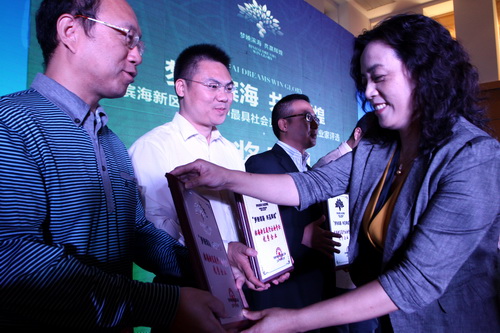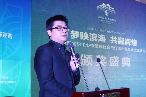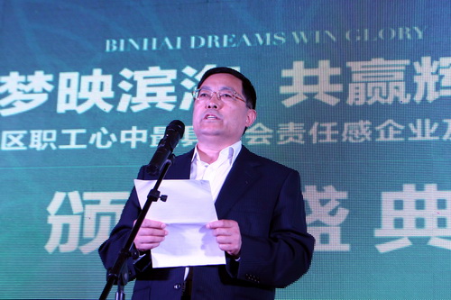 滨海新区总工会副主席张建起为“滨海新区履行社会责任优秀企业家”颁奖