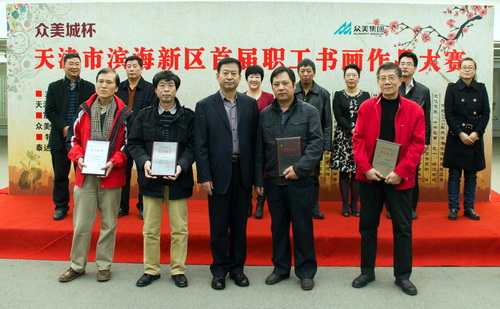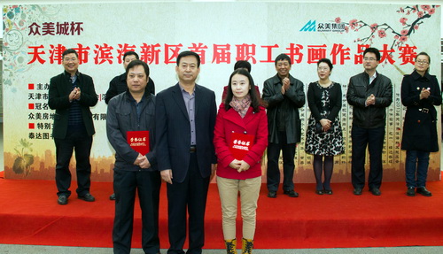 滨海新区总工会副主席张建起为“众美城”杯滨海新区首届职工书画大赛金奖得主颁奖