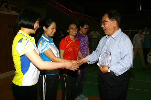 老同志罗远鹏为新区职工羽毛球女团颁发冠军奖牌