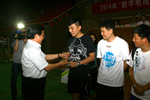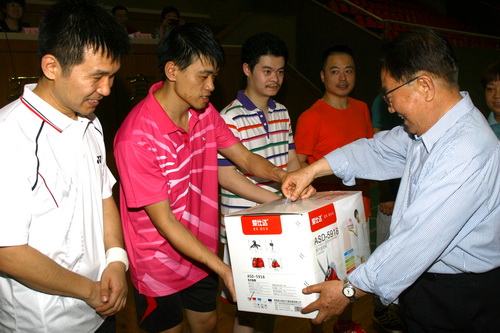 天津市总工会宣教部长申继臣为获得乙级组第三名的新区职工羽毛球男团乙级队颁奖