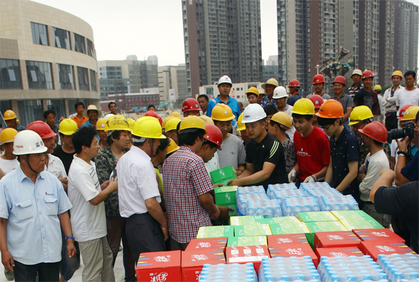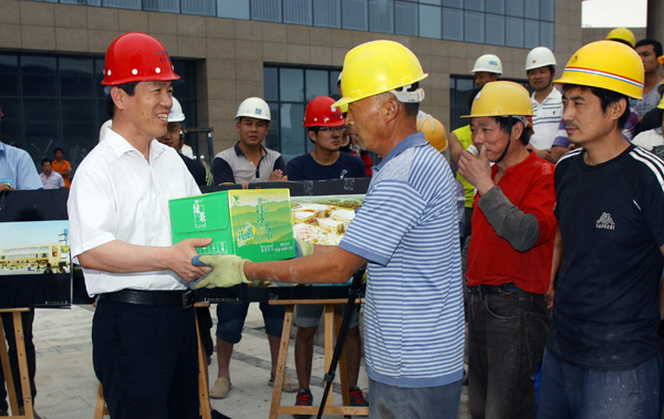 6月19日上午,区委常委、组织部长韩远达在区人大常委会副主任、总工会党组书记、主席刘明森,区总工会党组副书记、副主席李兆华的陪同下,来到泰达时尚广场建设工地,看望慰问广大参建职工,并送去了冰红茶、矿泉水等防暑降温饮品。这标志着2014年工会系统暑期“送凉爽、保安全”活动正式启动。