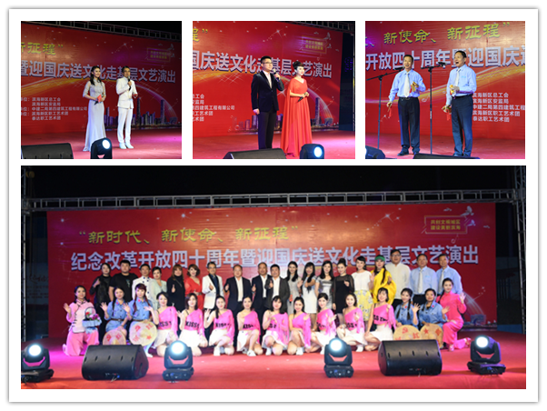 9月25日晚,由滨海新区总工会、滨海新区安监局联合主办的“新时代、新使命、新征程”纪念改革开放四十周年暨迎国庆送文化走基层文艺演出,走进中建二局四公司承建的天津融津汀兰苑项目工地,载歌载舞,喜迎国庆,庆祝改革开放取得的辉煌成就。活动由中建二局第四建筑工程有限公司协办。天津电视台新闻频道“都市报道60分”栏目以“迎国庆 送文化走基层”为题对本次演出进行了现场报道。