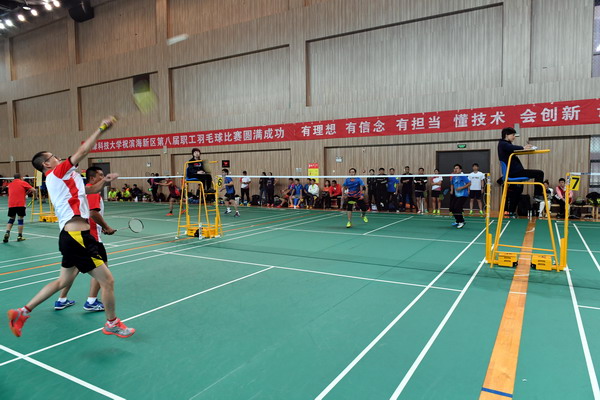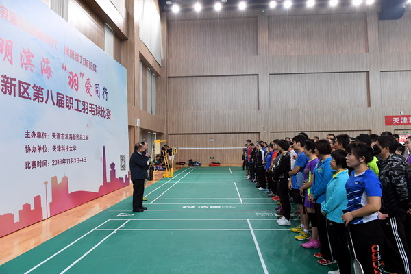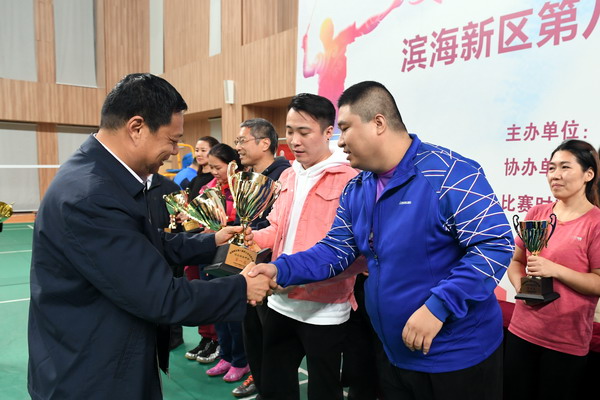 11月4日,“文明滨海 ‘羽’爱同行”滨海新区第八届职工羽毛球比赛在天津科技大学体育馆“收拍”。区总工会副主席刘润来出席闭幕式并为获奖队伍颁奖,来自新区各机关企事业单位的74支队伍、近600名选手参赛。