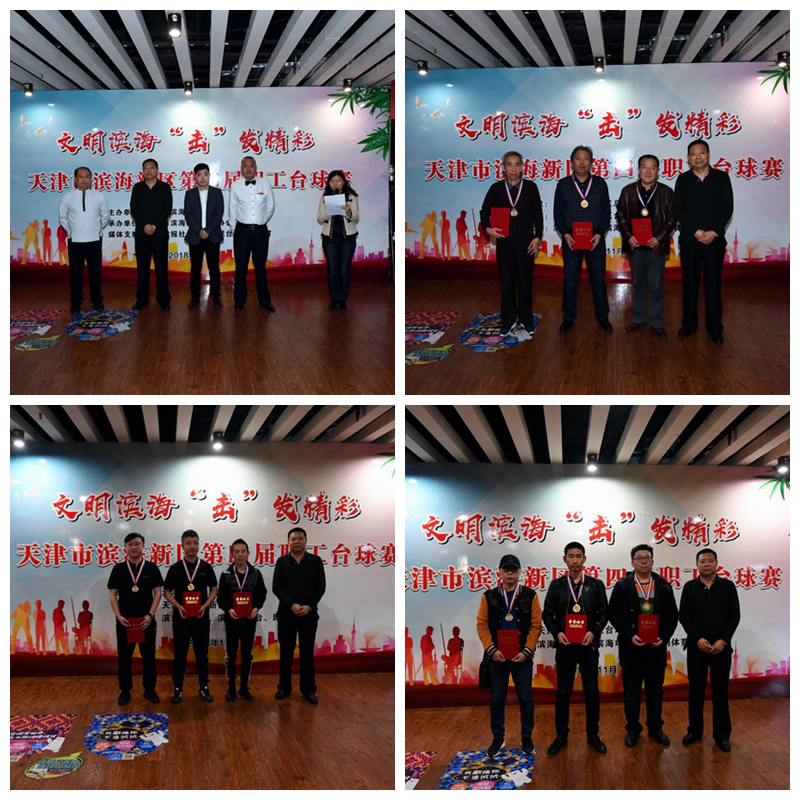 11月25日,“文明滨海 ‘击’发精彩”滨海新区第四届职工台球比赛在滨海新区晟川台球俱乐部圆满收杆。经过1145场次3426杆的激烈对决,王磊夺得中青年乙组冠军,李濛摘取中青年甲组桂冠,张星林获得中老年组冠军。保税区总工会、滨海新区建交局工会、塘沽街道总工会、汉沽街道总工会、金元宝商厦集团有限公司工会获得优秀组织奖。区总工会副主席刘润来出席闭幕式并为获奖选手颁奖。