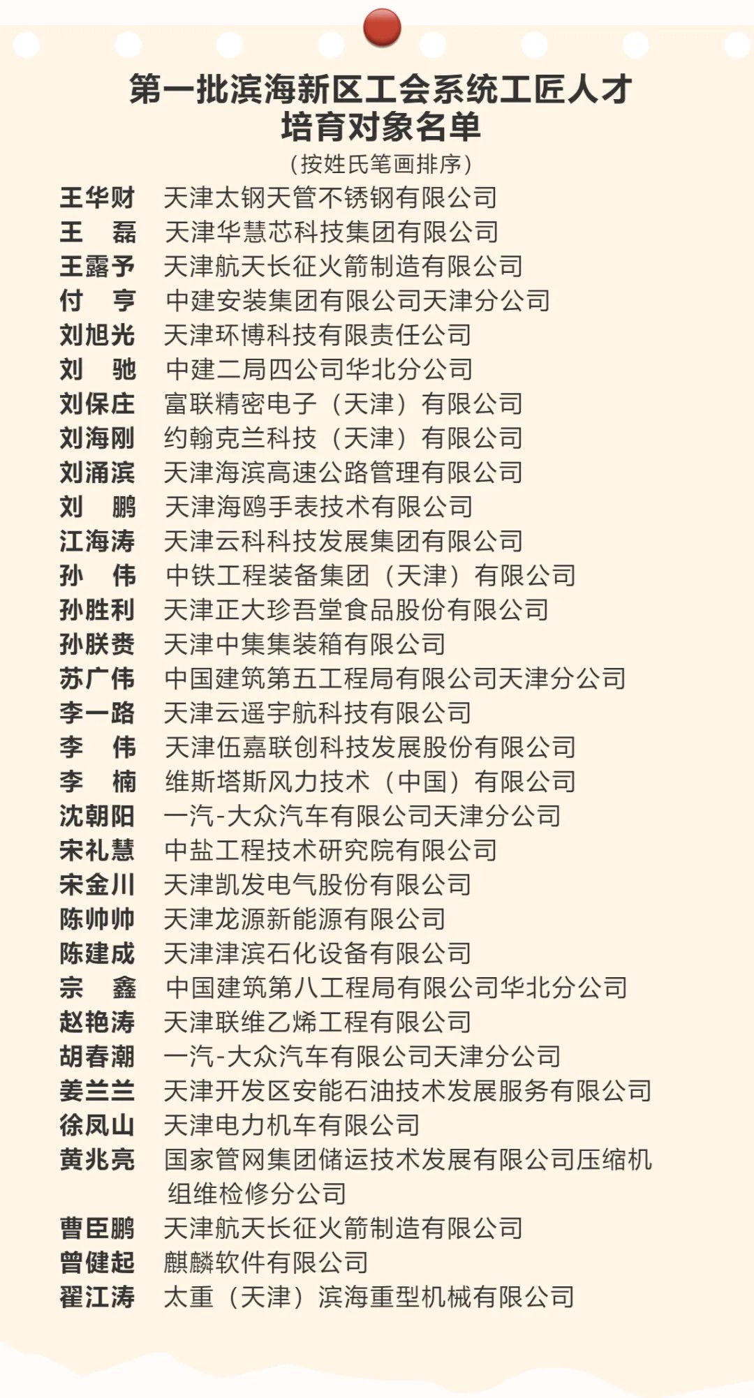 经各基层工会推荐、资格审核、综合评议、党组审议,现确定王华财等32名同志为第一批滨海新区工会系统工匠人才培育对象,正式纳入“滨海新区工会系统工匠人才库”,培育期自2026年1月起,为期两年。